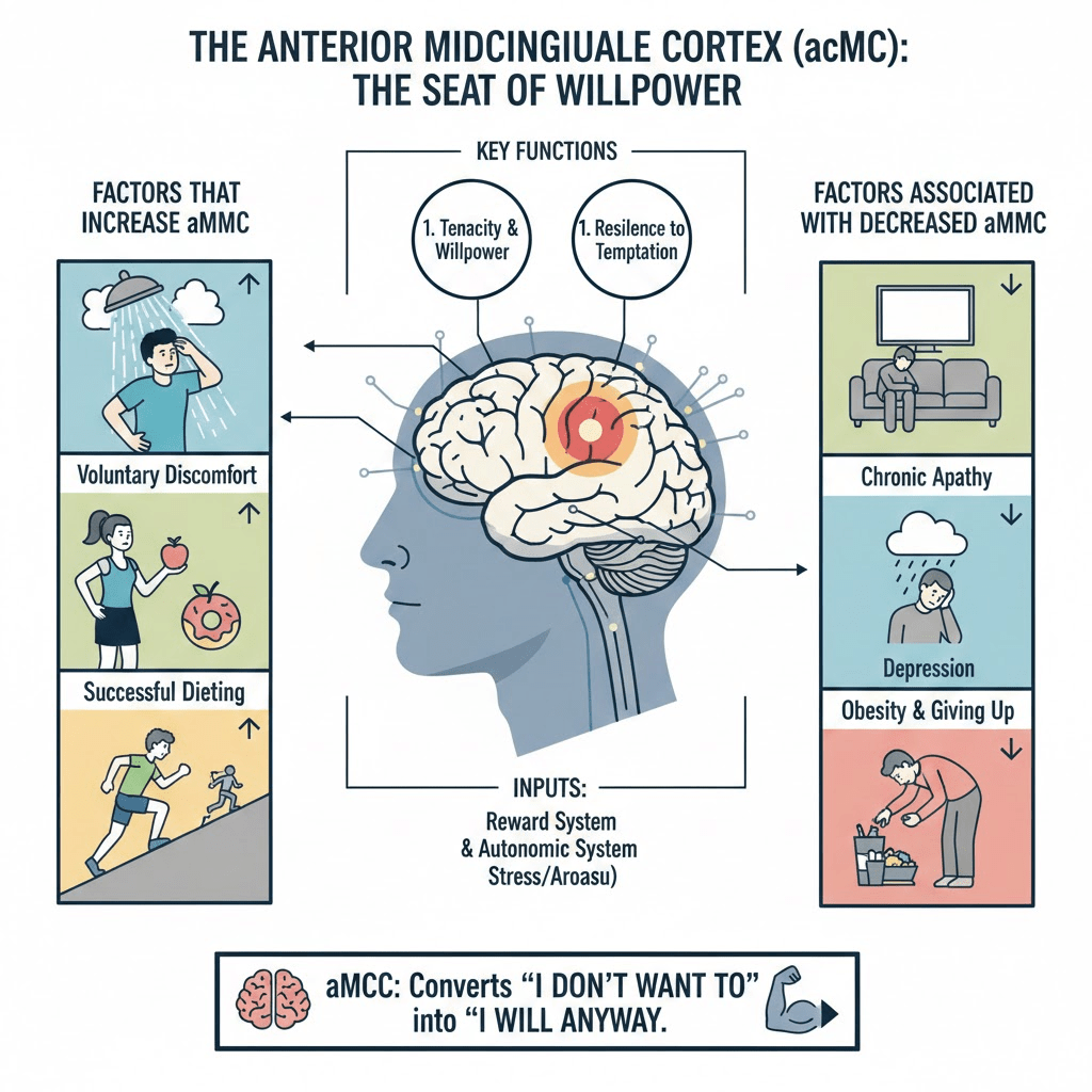 - Sources:The anterior midcingulate cortex (aMCC) is a significant brain region involved in various psychological and physiological phenomena. Andrew Huberman discusses several methods to assess the functionality and importance of brain areas like the aMCC, including observing changes in brain area size, examining brain injury impacts, and input from various systems like reward and autonomic systems. The aMCC receives robust input from these systems, indicating its involvement in tenacity and willpower .Further, it plays a central role in how individuals engage with challenges. When people do things they don’t want to do, the aMCC gets bigger, and it’s smaller in individuals facing obesity but grows when they diet. This growth is also evident in athletes and people who perceive themselves as overcoming challenges .Moreover, the aMCC’s activity levels and physical changes correlate with various conditions, including motivation levels, tenacity, resistance to temptation (such as food), and it links to critical brain functions such as the reward system. Reduced aMCC activity is associated with increased apathy, depression, and reduced motivational capacities .